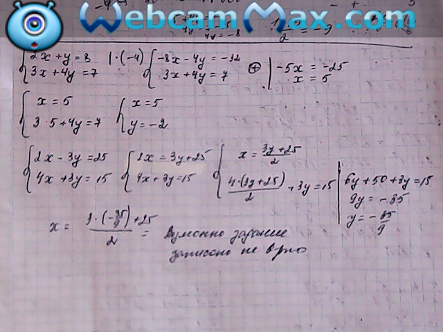 как решить системы 2 систему уравнения1) 2х+y=8;3х+4y=7.2)2х-3y=25;4х+3y=15; помогите пожалуйста