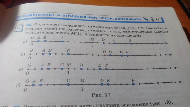 Определите координаты отмеченных точек (рис 17). Сделайте в тетради такой же рисунок,отметьте точки,симметричные данным относительно точки М(1),и запишите их координаты.