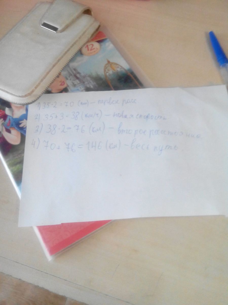 Катер плыл два ч со скоростью 35 км/ч. Потом он увеличил скорость на 3 км/ч. и плыл столько же часов. какой путь преодолел катер?