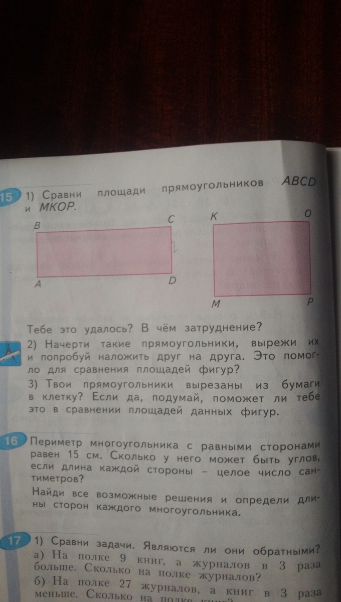 Если прямоугольники вырезать из бумаги в клетку, то надо сосчитать , сколько клеточек в каждом прямоугольнике - это и будет площадь прямоугольника. В котором будет больше клеточек, значит и площадь больше.