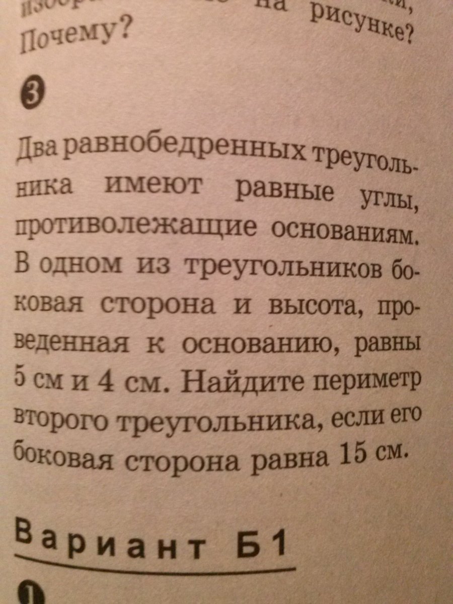 2. Треугольники подобны, т.к. углы при вершине равны, и углы при основании значит равны тоже (они равны между собой, т.к. треугольники равнобедренные). Коэффициент подобия = 15/5=3. Высота второго треугольника = 4*3=12. Найдем основание второго треугольника: из прямоугольного треугольника с гипотенузой 15, катетом 12 и вторым катетом, равным половине основания по т.Пифагора: 225-144=81 => половина основания=9. основание=18. Периметр=15+15+18=48