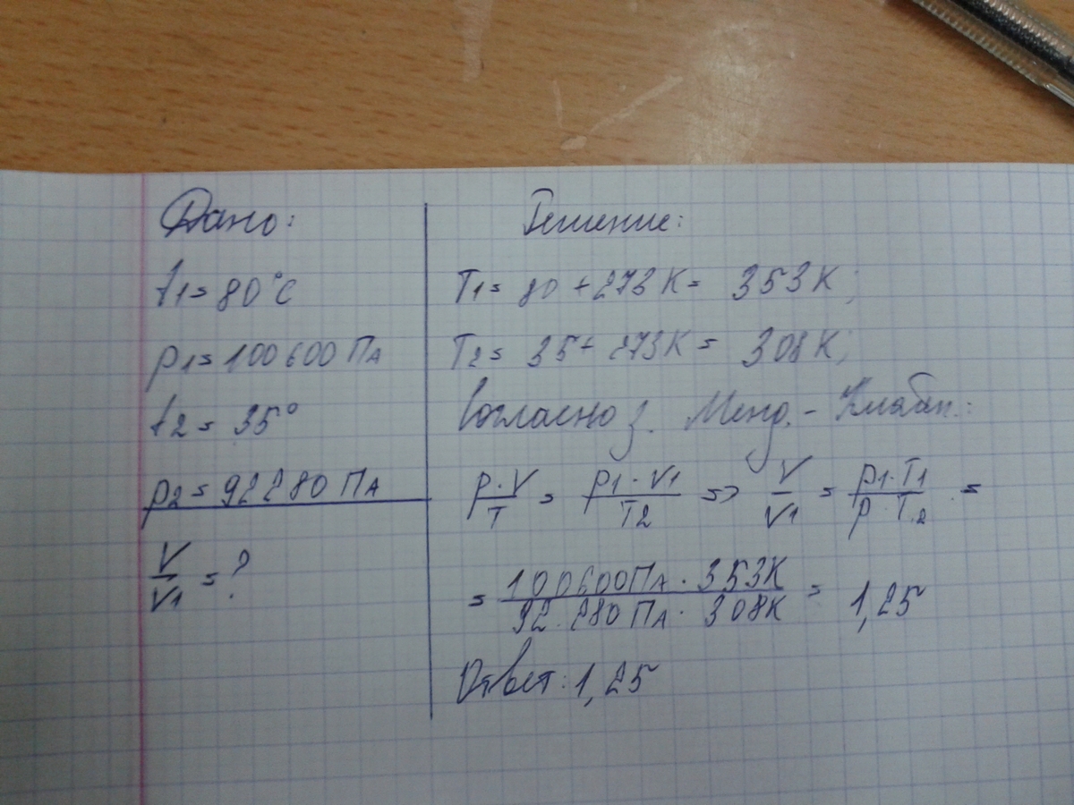 в газовый холодильник коксовый газ поступает при температуре 80 градусов цельсия и 100600 Па, а выходит при 35 граддусах цельсия и 92280 Па. Во сколько раз изменится объем этого газа?