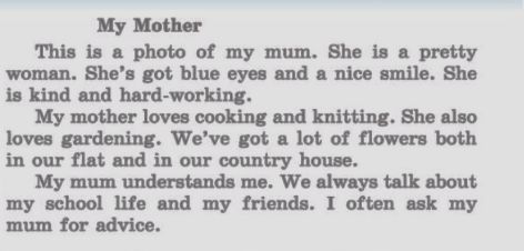 Это фотография моей матери. Она привлекательная женщина. У нее синие глаза и хорошая улыбка. Она добрая и трудолюбивая. Моя мама любит печенья и вязание. Она так же любит садоводство. У нас очень много цветов и в нашей квартире, и в нашем городском доме. Моя мама понимает меня. Мы всегда говорим на счет моей школы и моих друзей. Я часто спрашиваю у своей мамы совета.