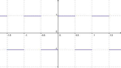 периодичная с периодом Pi функция: от -Pi/2 до 0 y=-1; от 0 до Pi/2 y=1. Все точки вида Pi/2*n выколоты. Во вложении построила график y=tg(pi*x)*|ctg(pi*x)| (он сжат в Pi раз по оси абсцисс, т.е. например x=2 соответствует 2Pi искомого графика, x=0.5 - x=Pi/2, etc.)