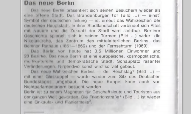 Новый Берлин снова открывает двери перед своими гостями. Бранденбургские ворота -- когда-то бывший символом раздела Германии -- в наше время снова символ немецкой столицы. В его городском ландшафте старое переплетается с новым,а будущее города становится очевидным. История Берлина невольно отразилась и на его башнях: церковь св.Николая,центр средневекового Берлина,Берлинская ратуша (1861-1869) и Берлинская телебашня.