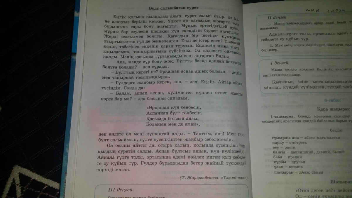 Спев эти строки она меня обняла. я поняла мама, теперь я не буду тучи рисовать. Я лучше нарисую девочку с лейкой сказала Енлик. Небо ясное, солнце светит, вокруг цветы, а посередине девочка с лейкой, поливает цветы. Мне цветы показались еще краше.