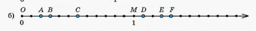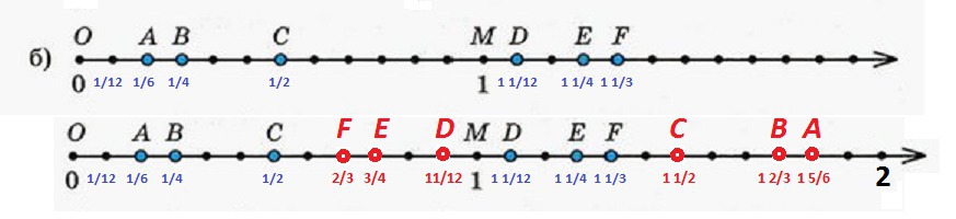 Дан координатный луч. Единичный отрезок равен 12. Это значит, что каждое деление равно = 1/12.