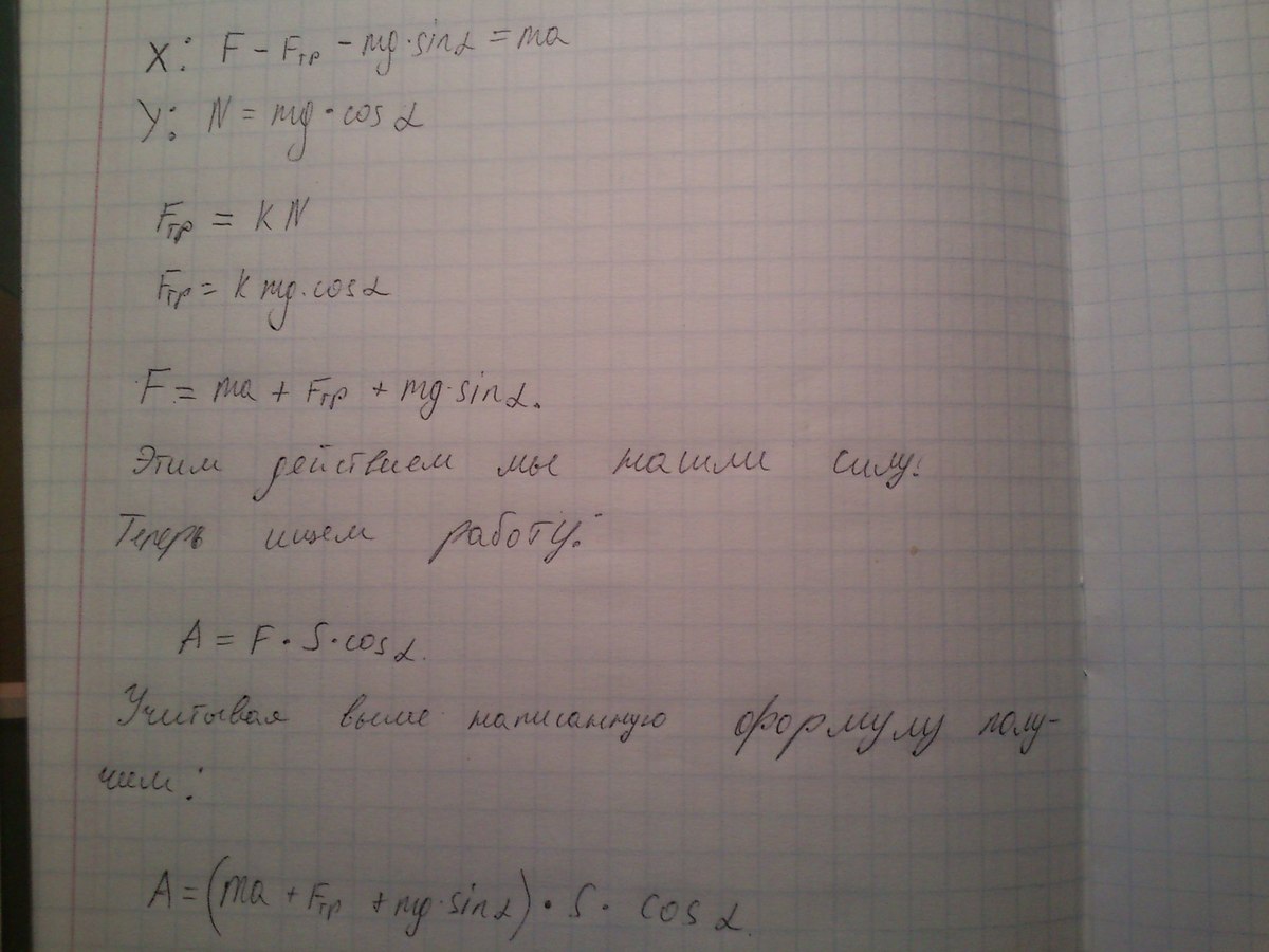 найти работу подъема груза по наклонной плоскости, если масса груза 100 кг, длина наклонной плоскости 2м, угол наклона 30 градусов, коэффициент трения 0,1 и груз движется с ускорением 1м/с в квадрате