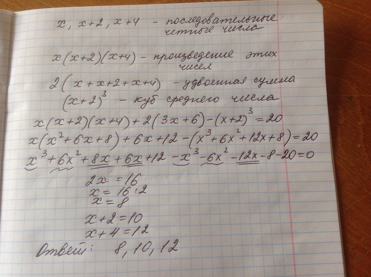 Если к произведению трёх последовательных чётных чисел прибавить их удвоенную сумму и вычесть куб среднего из них ,то получится 20.Найдите эти числа.