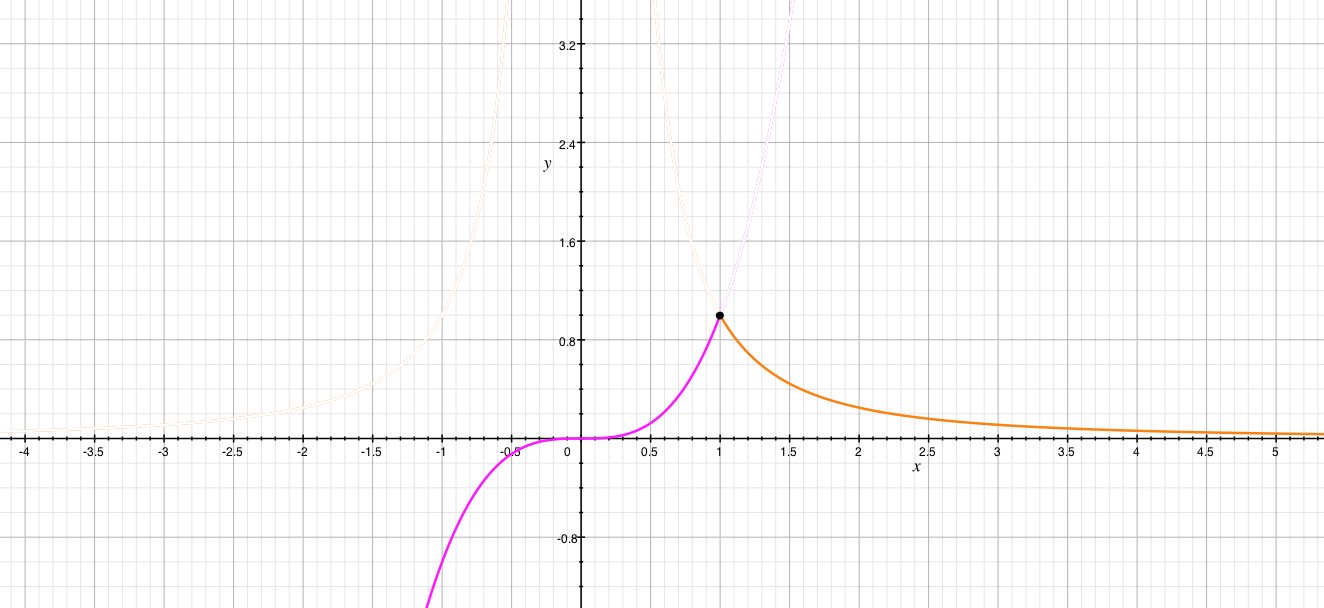 Вот начертил на компьютере оба графика (первое вложение), нужно только x^3 до x=+1 оставить, а 1/(x^2) после x=+1 (смотри второе вложение).