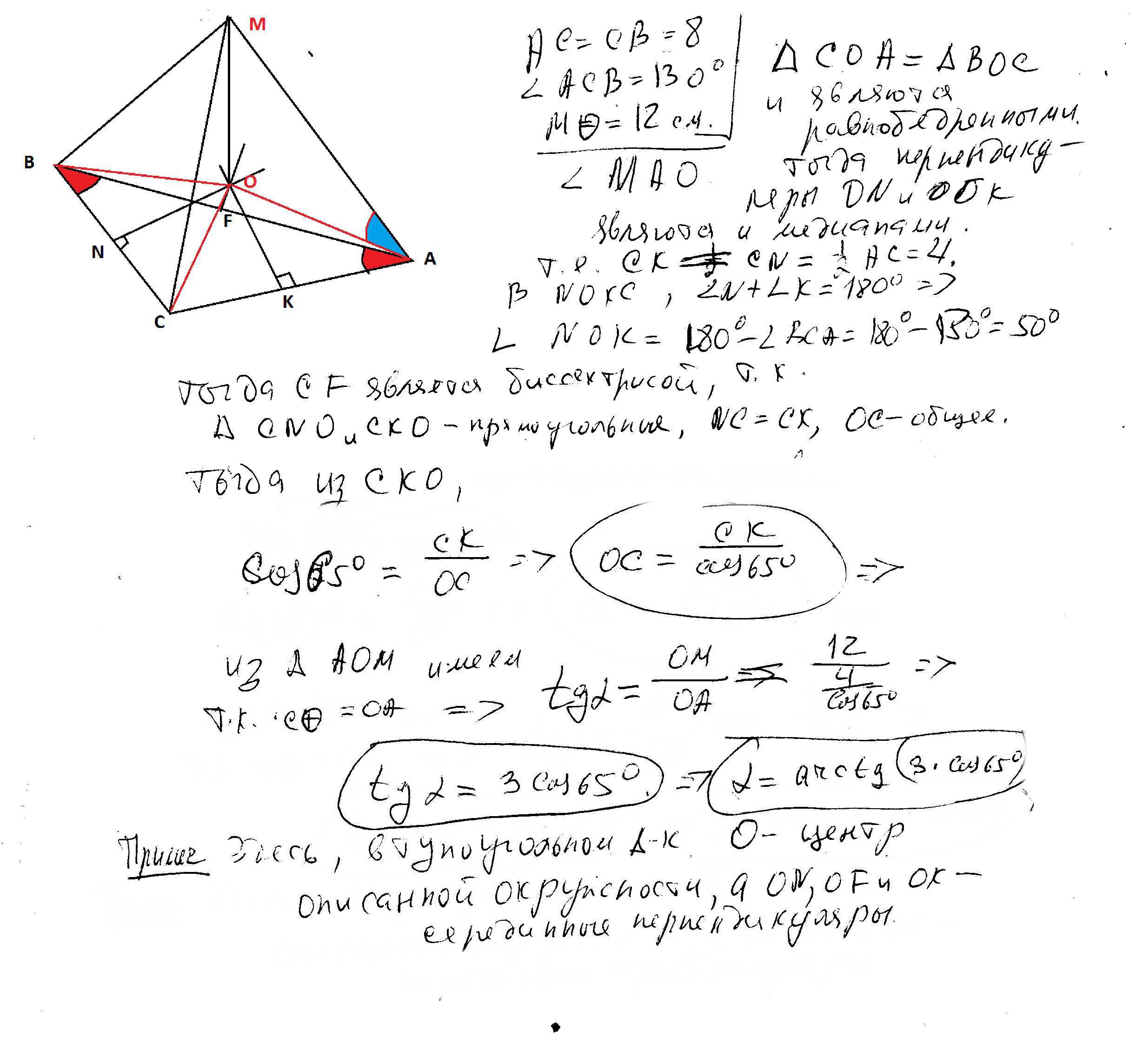 В треугольнике ABC, AC=CB=8, угол ACB= 130 градусов. Точка M удалена от плоскости треугольника на расстоянии 12 см и находится на равном расстоянии от вершин треугольника ABC. Найти угол между MA и плоскостью ABC