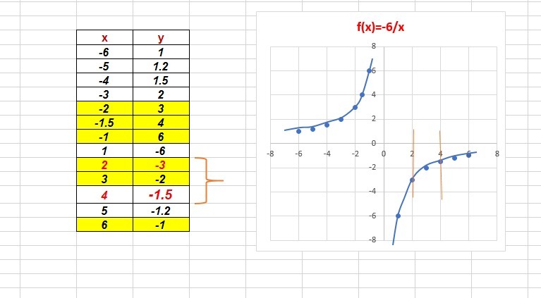 Известно, что график функции y=k/x проходит через точку A (2; -3). а) найдите значение коэффицента k. б) постройте график функции. в) найдите значения функции при x = -1; -2; 3; 6. г) найдите значения аргумента, если y = 6; 4; -3. д) найдите наибольшее и наименьшее значения функции на отрезке [2; 4]