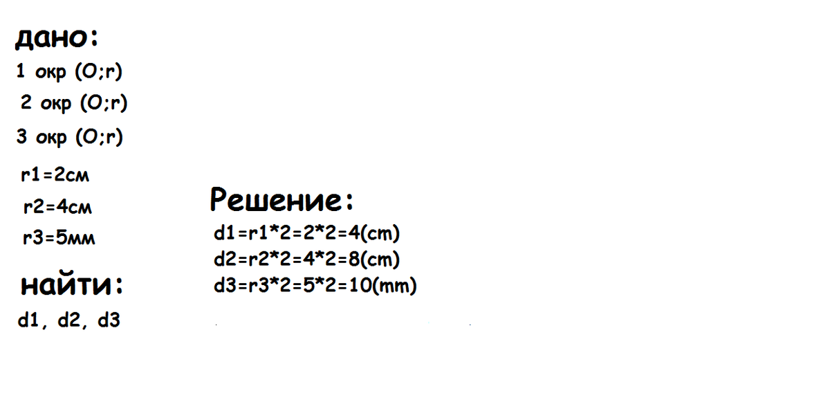 окр(О;r) - обозначение окружности. r - значок радиуса. d - значок диаметра. r1 - значок радиуса первой окружности. r2 - значок радиуса второй окружности. r3 - значок радиуса третьей окружности. d1 - диаметр первой окружности. d2 - диаметр второй окружности. d3 - диаметр третьей окружности. что непонятно еще? решение там самое простое. только умножение. таблицу умножения в третьем классе проходят, насколько я помню. это несложно