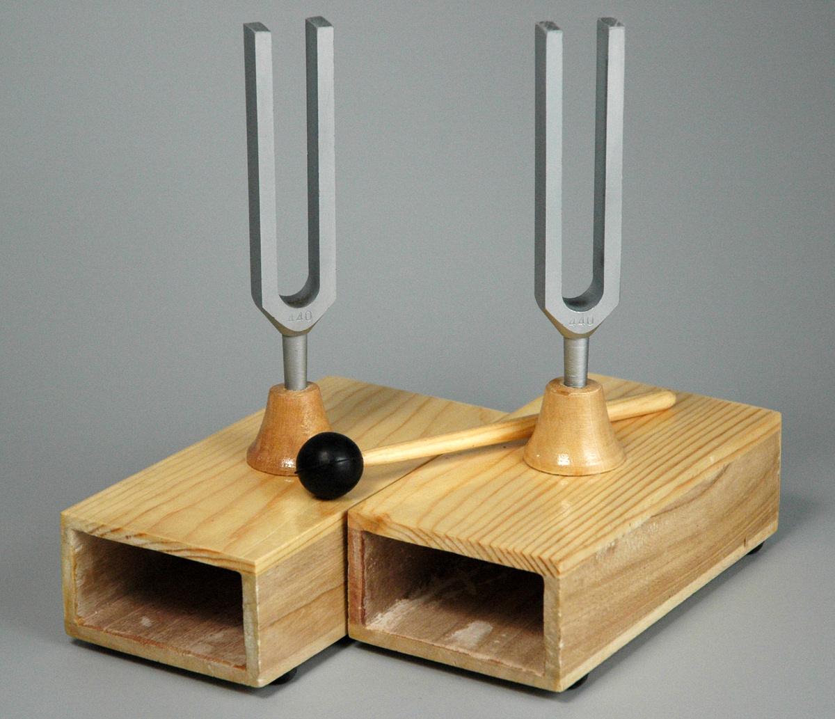 2)Если по камертону ударить мягким молоточком или провести по нему смычком, то камертон зазвучит. если мы поднесем к звучащему камертону легкий шарик, подвешенный на нитке, — шарик будет отскакивать от камертона, свидетельствуя о колебаниях его ветвей.Приложения: