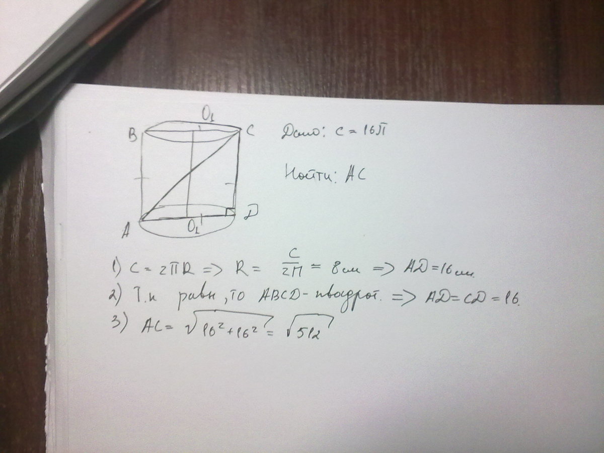 Длина окружности основания равностороннего цилиндра равна 16п см. Найти диагональ осевого сечения цилиндра (если можно с рисунком)
