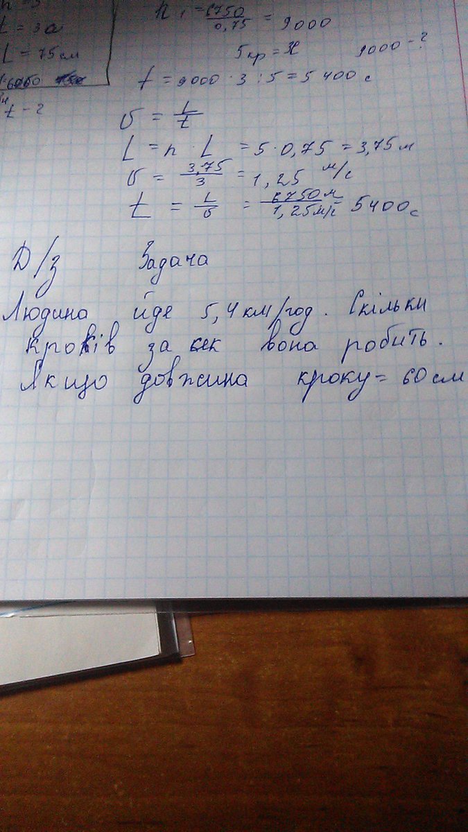 Людина йде 5,4 км/год .Скільки кроків за сек вона робить .Якщо довжина кроку = 60 см