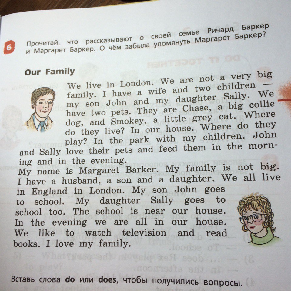 Меня зовут Маргарет Бэркер. Моя семья не большая. У меня есть муж, сын и дочка. Мы живем в Англии, в Лондоне. Мой сын Джон ходит в школу. Моя дочь Салли тоже. Школа находится около нашего дома. По вечерам мы все собираемся в нашем доме. Мы любим смотреть телевизор и читать книги. Я люблю свою семью.