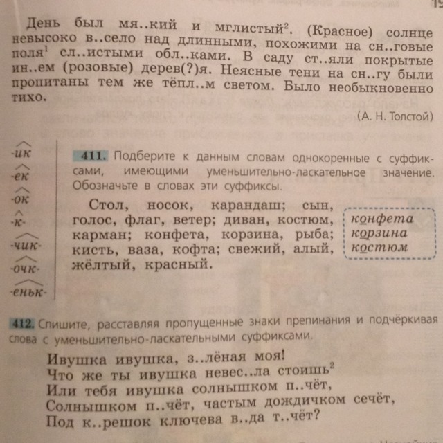 Номер 411 помогите. Подберите к данным словам однокоренные с суффиксами, имеющими уменьшительно-ласкательное значение.