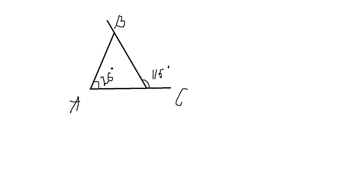 (как смежный с углом 26°). ВНЕШНИЙ угол при вершине С=115°(это дано), значит внутренний угол при этой вершине равен 180°-115°=65° (смежные).