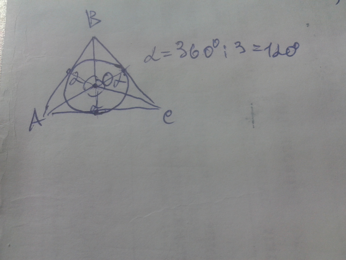 АО=ОВ=ОС=R. АВ=ВС=АС(т.к. треугольник равносторонний).ΔАОВ=ΔВОС=ΔАОС-по 3 равным сторонам.⇒∠АОВ=∠ВОС=∠АОС=α=360°:3=120°.