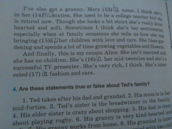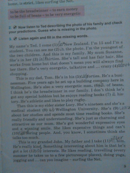 Меня зовут Тед. Я приехал из Новой Зеландии. Мне 15 лет и я студент. Вы можете увидеть меня на фотографии. Среди двух детей я младший. И это моя семья. Моя мама Сюзанна. Ей далеко за тридцать. Она высокая и у нее светлые волосы. Она работает дома, но это не значит, что ее всегда можно там найти. Она очень энергичная, коммуникабельная и еще она страстно любит походы по магазинам (шоппинг).