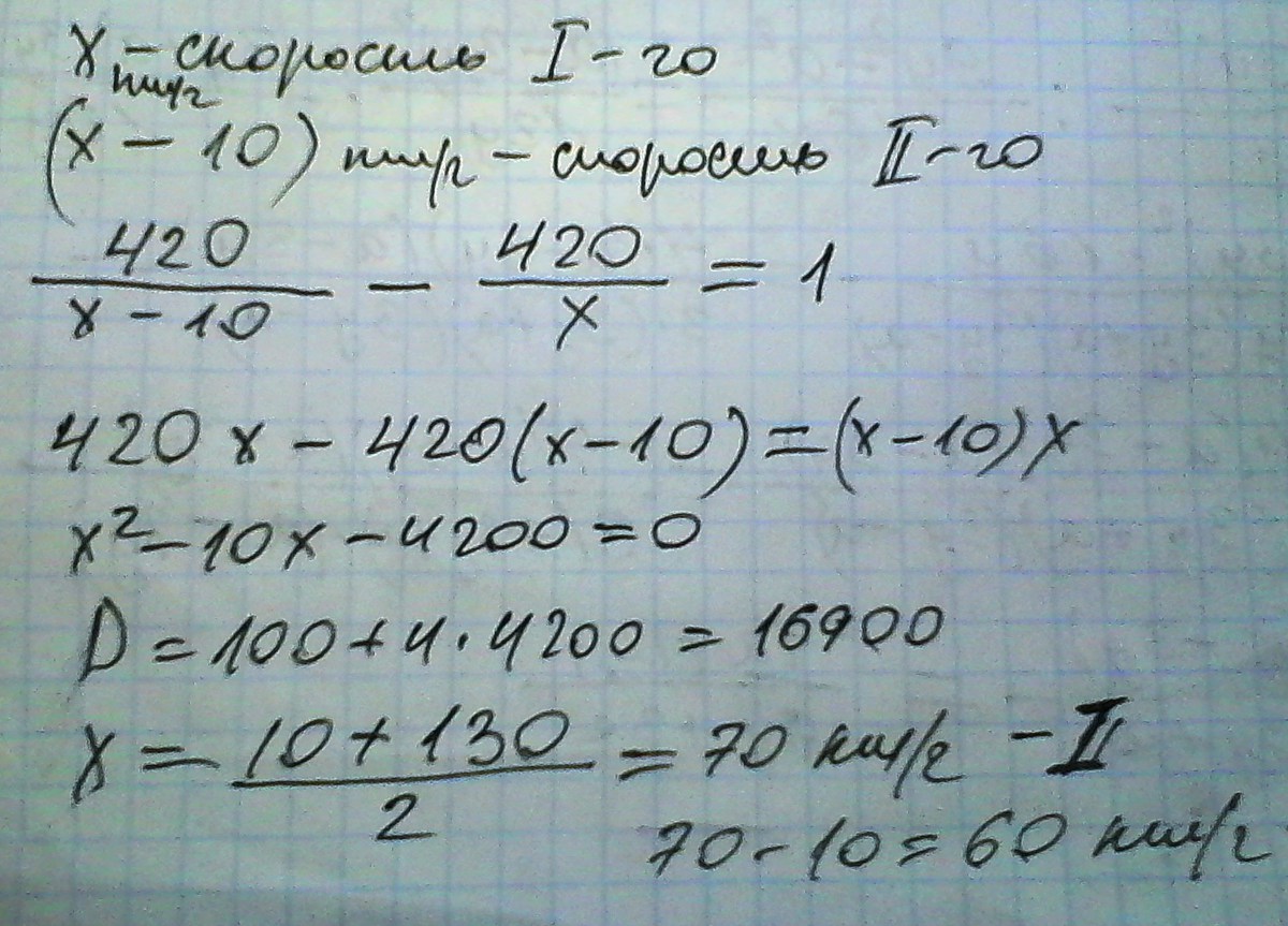 Два автомобилиста отправляются в 420 километровый пробег. Первый едет со скоростью на 10 км/час больше ,чем второй ,и прибывает к финишу на 1 час раньше второго. Найти скорость автомобиля ,пришедшего к финишу вторым.