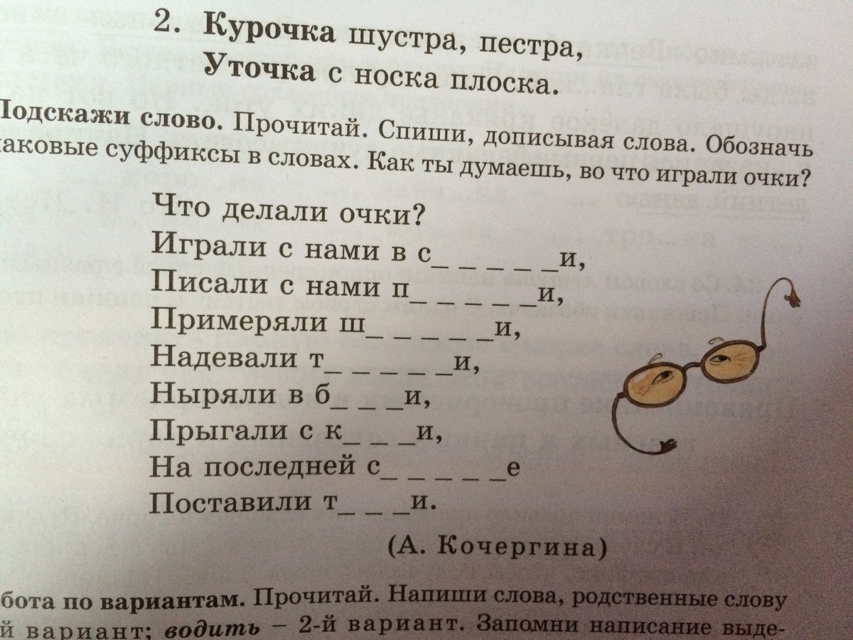 Подскажи слово. Прочитай. Спиши, дописывая слова. Обозначь одинаковые суффиксы в словах. Как ты думаешь, во что играли очки?