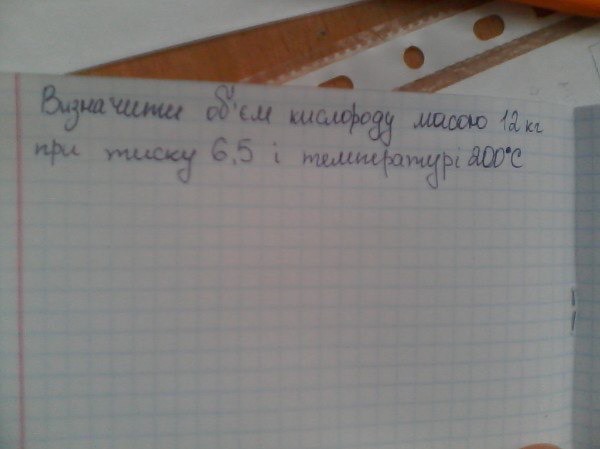 Вичислить обьем кислорода весом 12кг при давлении 6,5 и температури 200С