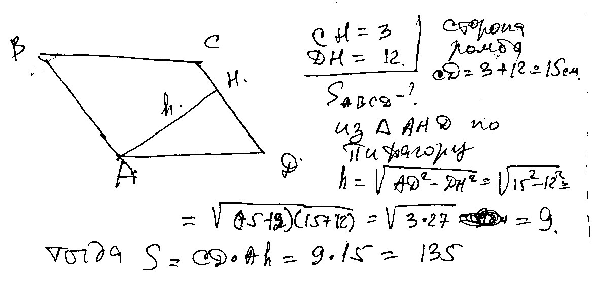 Высота AH ромба ABCD делит сторону CD на отрезки DH=12 и CH=3. Найдите площадь ромба.