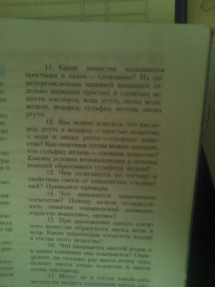 12.сложные вещества не сохраняют свойств простых веществ из которых они образовались. Например, в образовании воды принимают участие 2 газа: водород и кислород. каждый из них имеют набор своих отдельных свойств. водород взрывоопасный, например, а кислород поддерживает горение. Вода же совершенно не имеет этих свойств, хотя образована этими газами. Ртуть, кислород и водород не возможно раскладывать на другие вещества, а воду и оксид ртути можно. в первом случае под действием электрического тока образуется кислород и водород, во втором ртуть и кислород. Другими словами, сложные вещества можно раскладывать на другие вещества, а простые - нет. Ну и потом, сложные вещества, вода и оксид ртути состоят из 2 разных атомов, а кислород, ртуть и водород - из 2 атомов одного и того же элемента.