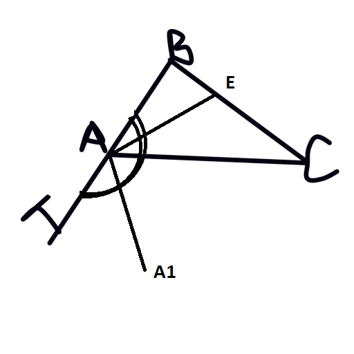 постройте биссектрису АЕ треугольника АВС и биссектрису угла САТ,смежного с углом А треугольника.