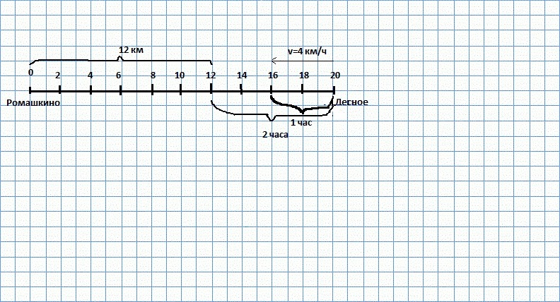 Расстояние между Ромашкино и лесное 20км. построй шкалу с ценой деления 2км. Покажи на ней движение пешехода из лесного в ромашкино со скоростью 4кмч . через какое время после выхлда он нахлдился на расстоянии 12км от ромашкино?