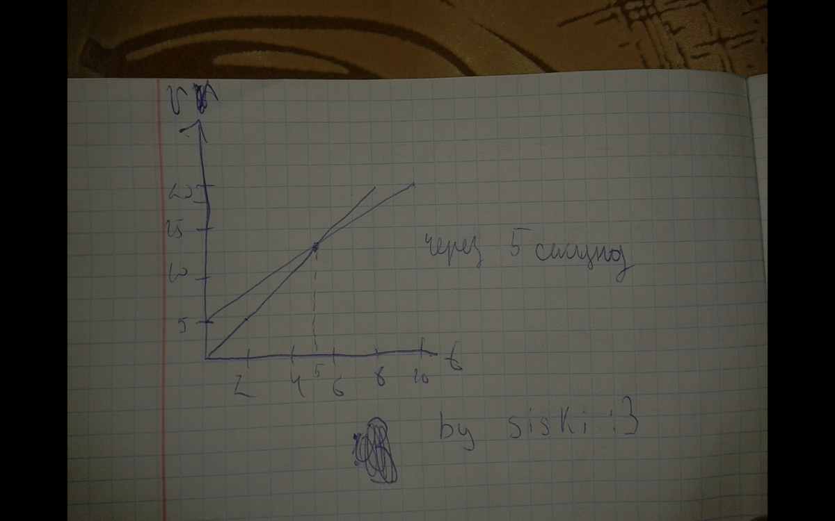 Два тела начали одновременно двигаться равноускоренно: одно с начальной скоростью 5м/с и ускорением 1,5м/с 2 , другое без начальной скорости с ускорением 2,5м/с 2 . Построить графики их движений и по графикам определить, через сколько времени оба тела