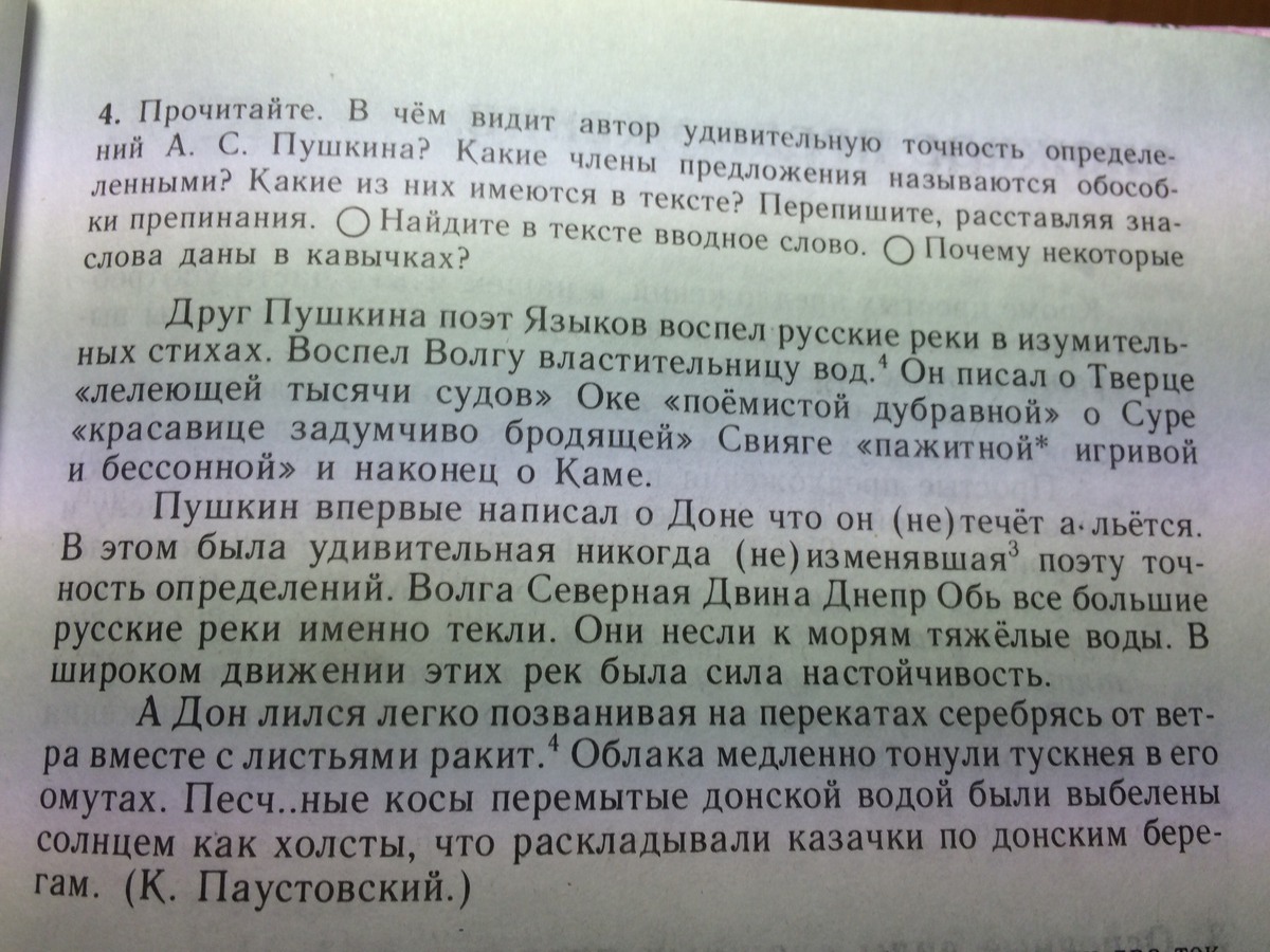 Пушкин, впервые написал о Доне, что он (не) течёт, а льётся. В этом была удивительная, никогда (не) изменявшая3 поэту, точность определений. Волга, Северная Двина, Днепр, Обь - все большие русские реки, именно текли. Они несли к морям тяжёлые воды. В широком движении этих рек была сила, настойчивость.