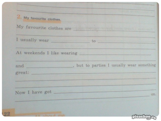 My favorite clothes are dresses and jackets. I usually wear a blouse and a skirt to school. At weekends I like wearing T-shirts and jeans, but to parties I usually wear something great: elegant dresses or short skirts with shirts.