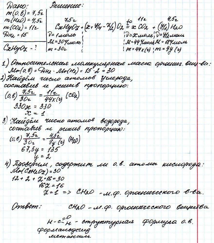 При сжигании 7,5 г органического вещества( н. у.) образуется 4,5 г водяного пара и 11 г оксида углерода(4). Найдите молекулярную формулу вещества и назовите его, если известно, что плотность его пара по водороду равна 15.