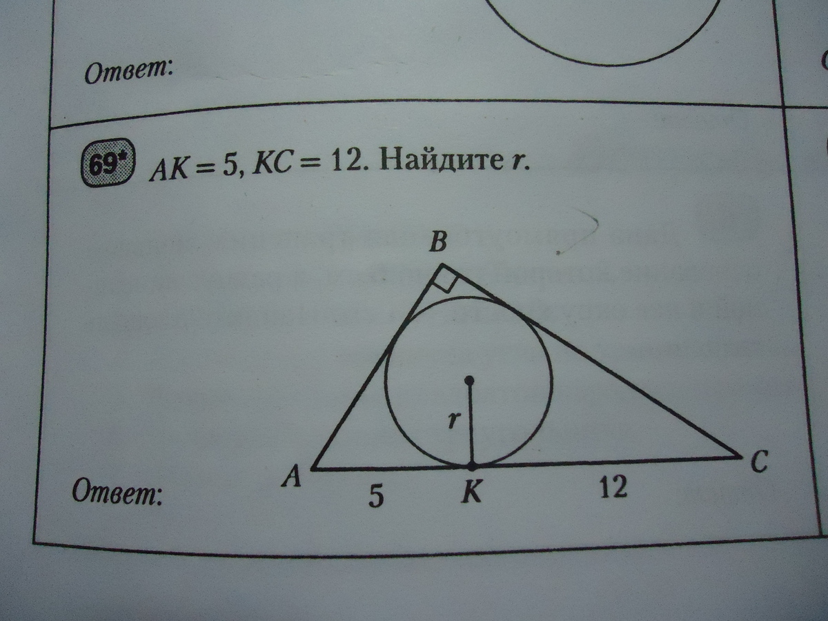 Ну, "в лоб" решать надо так - из центра окружности проводятся радиусы в точки касания, то есть перпендикуляры к катетам, и там получается квадрат (его образуют эти радиусы и касательные из вершины прямого угла), то есть катеты равны r + 5 и r + 12.