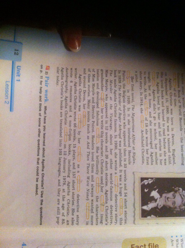 Агата Кристи является самым известным в мире детектив писатель. Кристи называют Книгу рекордов бестселлера всех времен. Агата Кристи родилась в Девоне, Англия, 15 сентября 1890 г. Она была талантливым ребенком. Она любила книги и научился читать, прежде чем она была пять. Агата любила слушать и рассказывать истории в ее Агате не идти в школу, ее мать учила ее дома, и она призвала Агату писать. На 18 она написала первый рассказ. В 1914 году, она тп Арчибальда Кристи пилота. г первый роман, Таинственное происшествие в Стили, в 1920 году В нем она представила Пуаро, бельгийский детектив, который оказался тогда в 33 В 1926 Убийство Роджера Акройд опубликовал книгу было сделано Агата Кристи известным. В 1930 году, она сделала Убийство в доме викария о ее флористику мисс Марпл, который это этот персонаж. 2 романа и 20 выстрел бабушка