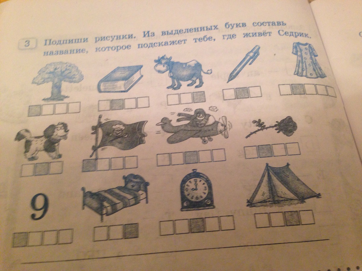 подпишите рисунки из выделенных букв составь название,которое поскажеттебе, где живет седрик