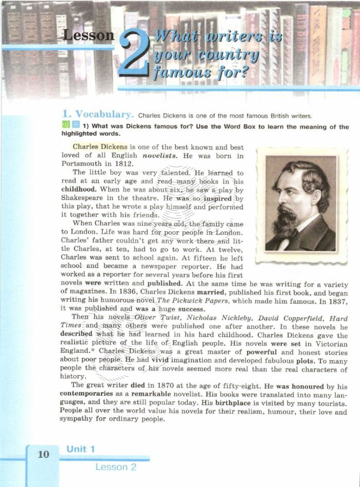 Чарльз Диккенс является одним из самых известных и самых любимых всех английских романистов. Он родился в Портсмуте в 1812 году был очень Мальчик талантлив. Он узнал, т читать в раннем возрасте и прочитал много книг в детстве. Когда ему было около шести лет он увидел играть Шекспира в театре. Он был настолько вдохновлен игрой, что он написал сам играть и сделал вместе со своими друзьями, когда Чарльз был девять лет семья приехала в Лондон. Жизнь была тяжело далеко бедные люди отец Лондоне Чарльза не мог получить любую работу там и лит TLE Чарльза в десять, пришлось идти на работу. В двенадцать Чарльз был отправлен в школу снова. В пятнадцать лет он оставил школу и стал газетным репортером. Он работал в качестве репортера в течение нескольких лет, прежде чем его первые романы были написаны и опубликованы. В то же время он писал для журналов вар. В 1836 году, Чарльз Диккенс женился, опубликовал свою первую книгу, и писать его юмористический роман Записки Пиквикского клуба, который сделал его знаменитым. В 1 была опубликована и имела огромный успех Затем его романы ouver Tuist, Николаса Никльби, Дэвид Копперфильд, H Таймс и многих других были опубликованы один за другим. В этих романах описал то, что он узнал в своем жестком детства. Чарльз Диккенс дал реалистическую картину жизни английского народа. Его романы были установлены в VICTO Англии. Чарльз Диккенс был великим мастером мощного и честного СТО Он был ярким, чтобы о бедных людях. люди герои его романов, казалось более реальным, чем reai характера Великий писатель умер в 1870 году в возрасте пятидесяти восьми лет. Он был удостоен eontemporaries как замечательного писателя. Его книги были переведены на многие ров с, и они по-прежнему популярны и сегодня. Его родина посещают многие люди тур по всему миру ценят свои романы за реализм, юмор, свою любовь сочувствие обычного reople