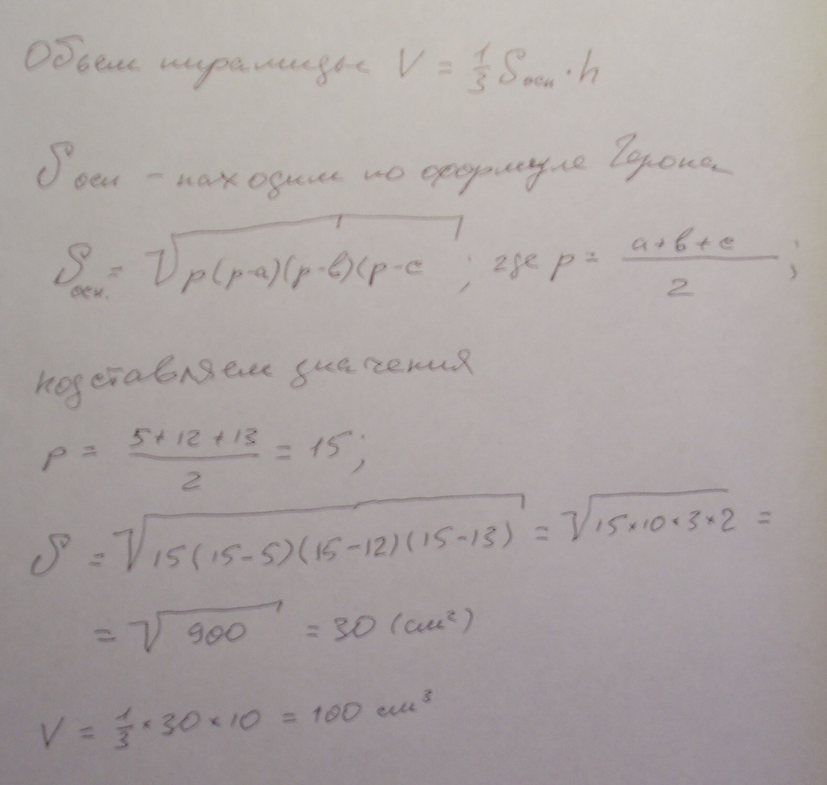 Основанием пирамиды МАВС служит треугольник со сторонами АВ = 5 см, ВС = 12 см, АС = 13 см. Найдите объём пирамиды , МВ ⊥ АВС и МВ = 10 см.