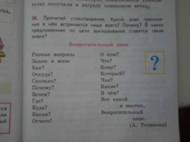 уп 36. Прочитай стихотворение. Какой знак препинания в нём встречается чаще всего? Почему?В каких предложениях по цели высказывания стаятся такие знаки?