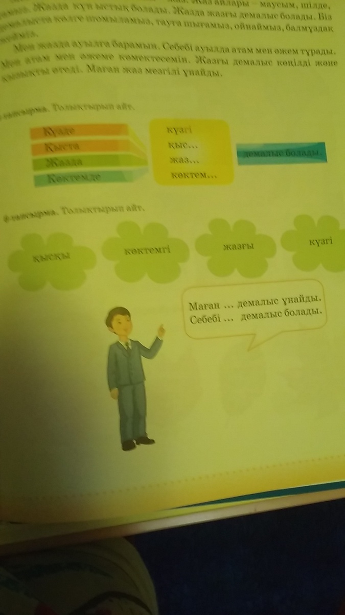 маган кыскы демалыс унайды. Себеби жазгы демалыс узак болады. Жазда суга тусип, кызыкты ойындар ойнаймыз.