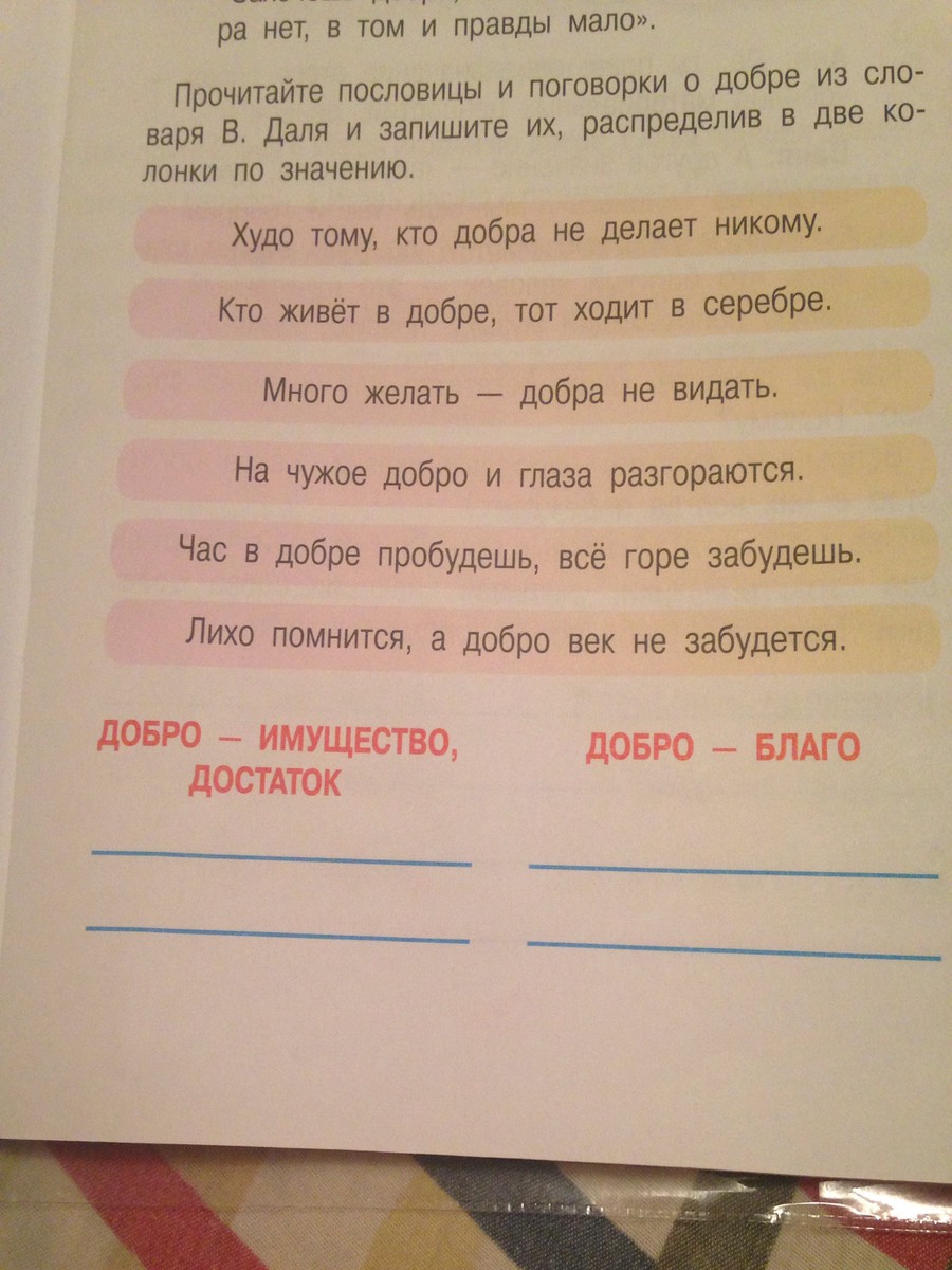 Прочитайте пословицы и поговорки о добре и запишите распределив в две колонки по назначению. См. фото