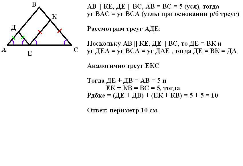 № 4. Боковая сторона равнобедренного треугольника равна 5 м. Из точки, взятой на основании этого треугольника, проведены две прямые, параллельные боковым сторонам. Найдите периметр получившегося параллелограмма.