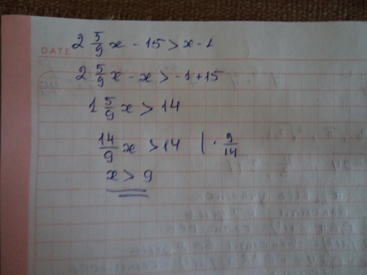 2 5/9х - х> 15 - 1 1 5/9х>14 х >9 ----о-----> 9 + бесконечность(8по вертикали) х€ (9; + бесконечность) Ответ: (9; + бесконечность)