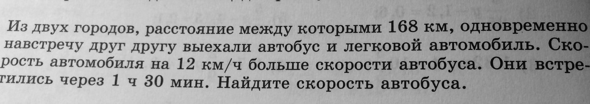 Из двух городов расстояние между которыми 168 км Одновременно навстречу друг другу выехали автобус и легковой автомобиль скорость автомобиля на 12 километров час больше скорости автобуса они встретились через 1 час 30 минут Найдите скорость автобуса.