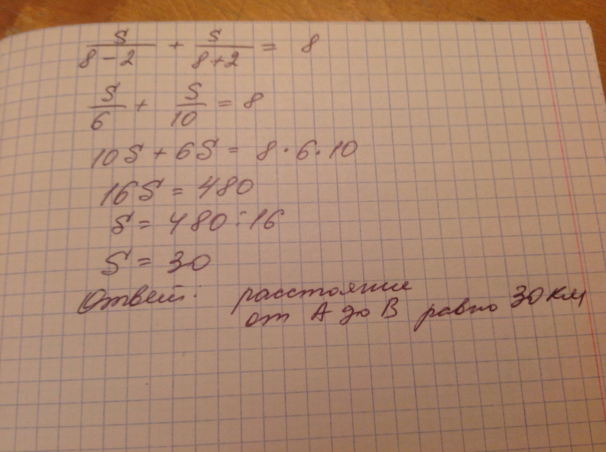 Расстояние по реке между пунктами а и Б туда и обратно катер проходит за 8 часов. Найдите это расстояние если собственная скорость катера восемь километров в час а скорость течения 2 км час