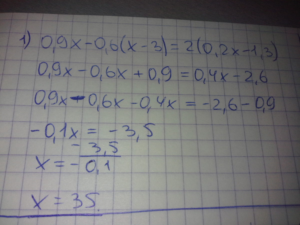 1)0,9х-0,6(х-3)=2(0,2х-1,3)