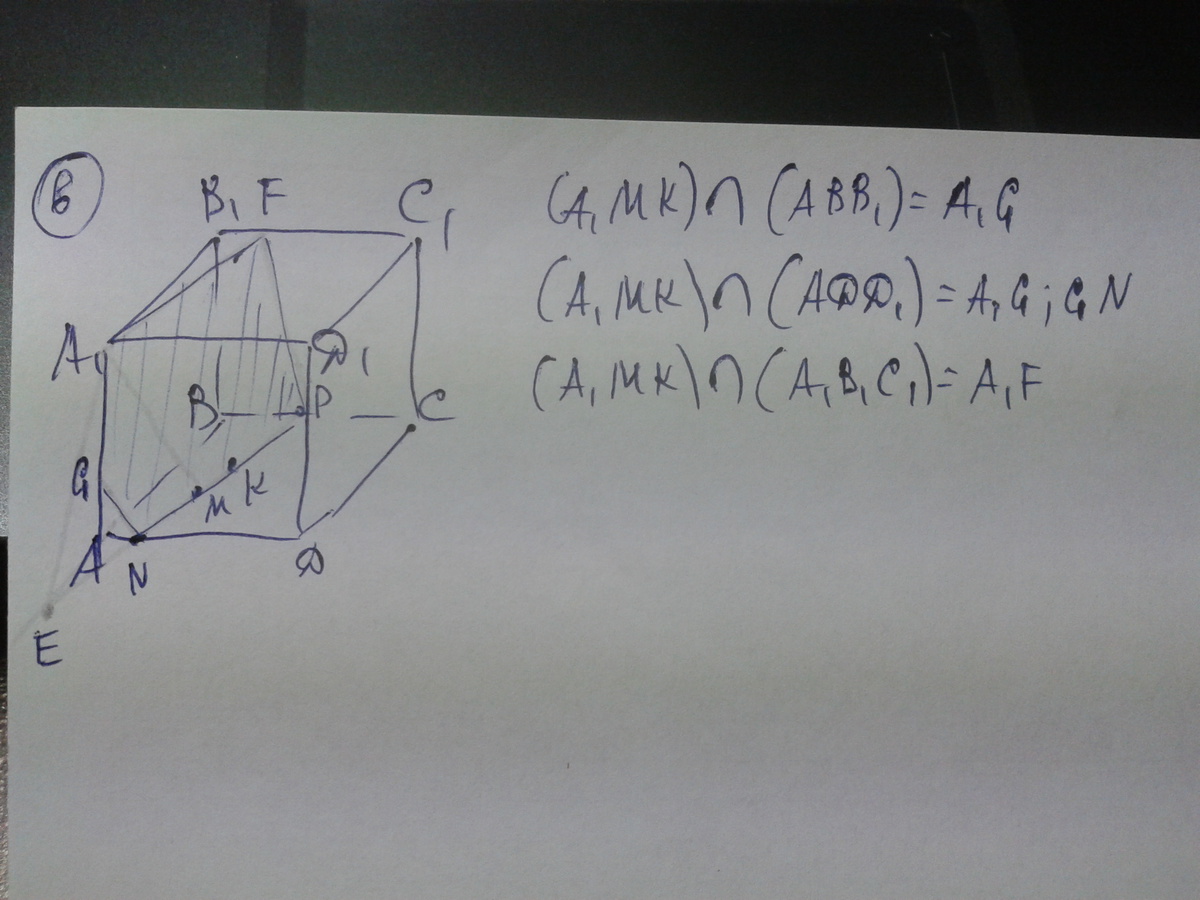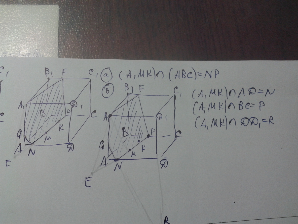 а) прямую пересечения плоскости А1МК и плоскости грани ABCD куба; б) точки пересечения плоскости А1МК с прямыми, содержащими ребра AD, ВС и DD1 куба; в) отрезки прямых, по которым плоскость А1МК пересекает грани АВВ1А1, ADD1A1 и A1B1C1D1 куба.